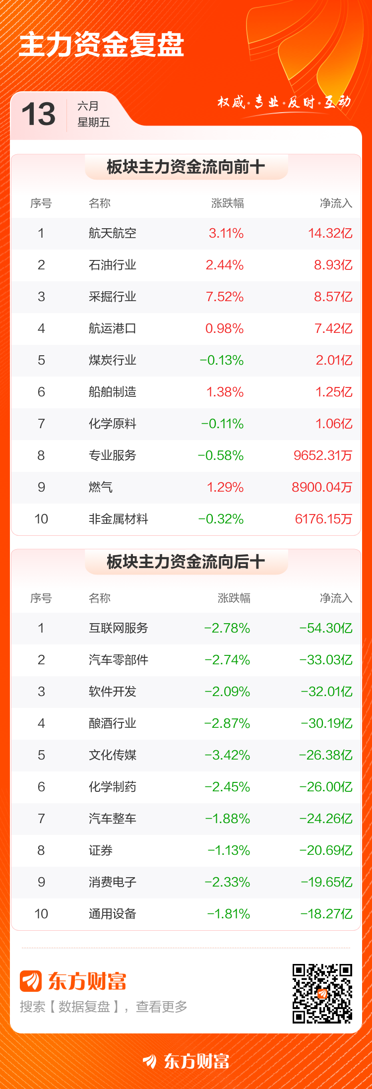 6月13日,沪指跌0.75%,深成指跌1.1%,创业板指跌1.13%。两市成交额1.47万亿,较上个交易日放量1955亿。数据显示,今日大盘主力资金净流出605.87亿。航天航空、石油行业、采掘行业等板块主力资金流入排名居前,其中航天航空净流入14.32亿元。