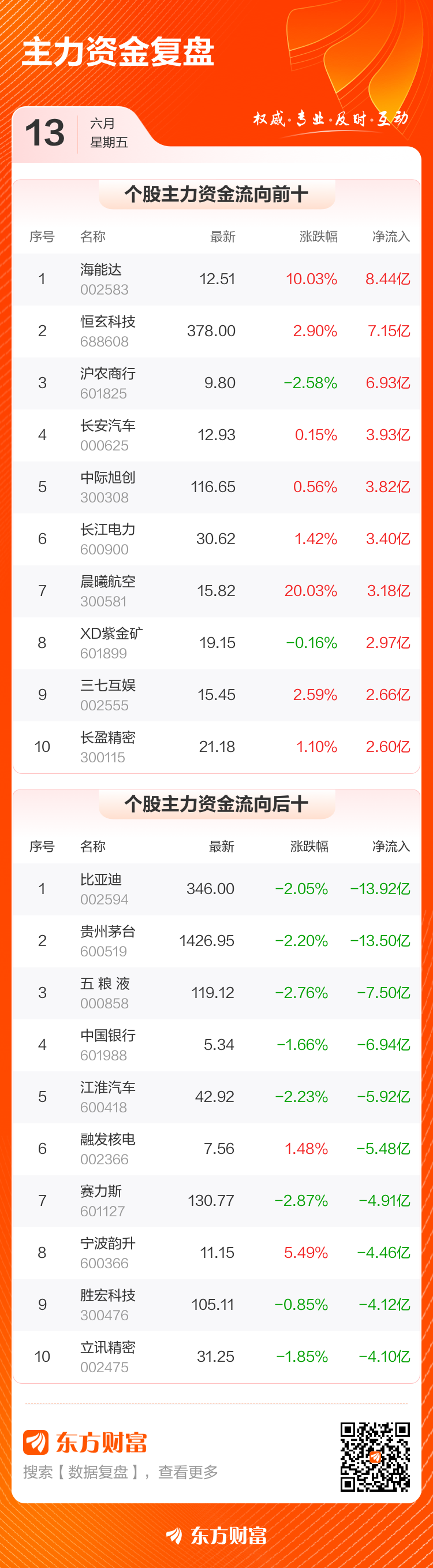主力净卖出个股中,比亚迪排名第一,主力净卖出13.92亿元;贵州茅台排名第二,主力净卖出13.50亿元。